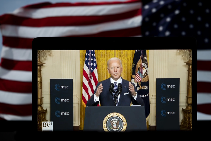 这是2月19日在美国弗吉尼亚州阿灵顿拍摄的美国总统拜登出席慕尼黑安全会议线上特别会议的视频画面。新华社记者 刘杰 摄