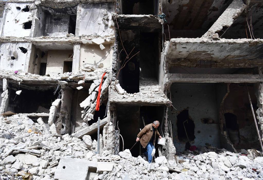 3月11日,叙利亚霍姆斯老人哈迪·古松走在被炸毁的建筑里。新华社发