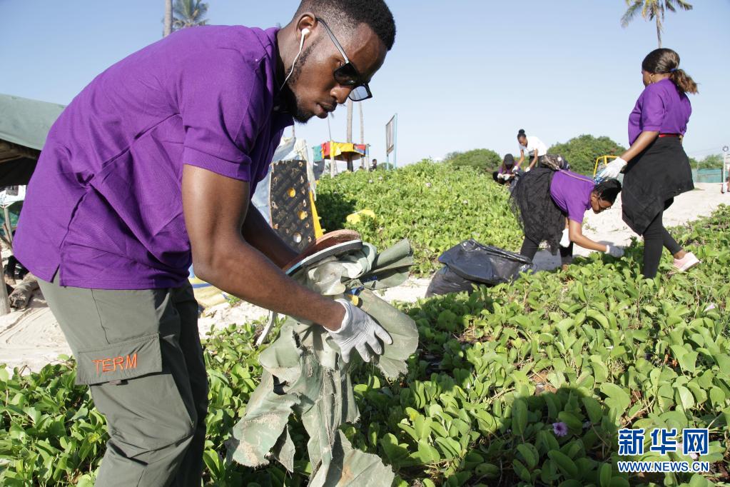 6月5日,志愿者在坦桑尼亚达累斯萨拉姆捡拾垃圾。新华社发(赫尔曼·埃马纽埃尔 摄)