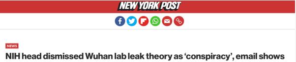 据《纽约邮报》2日报道,新公布的邮件显示,美国国家卫生研究院院长柯林斯曾在邮件中驳斥新冠病毒起源于“武汉实验室”的说法,批评这是阴谋论。