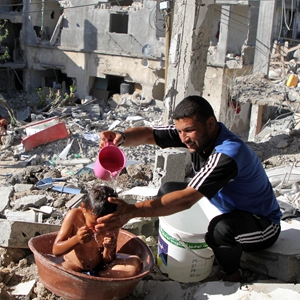 6月7日,在加沙地带北部拜特哈嫩,巴勒斯坦人坐在遭以军空袭损毁的建筑旁。