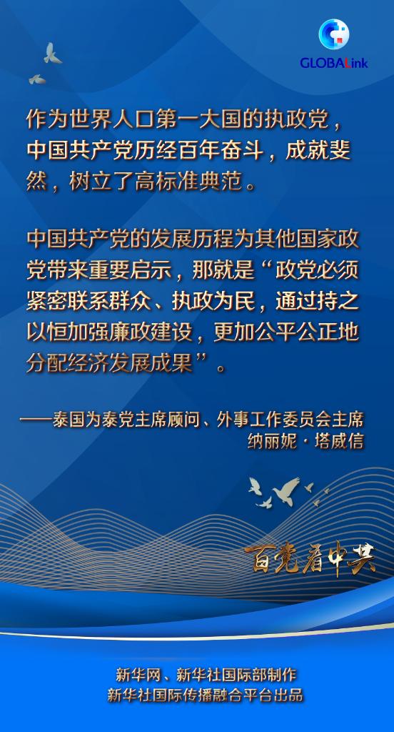 泰国为泰党主席顾问、外事工作委员会主席纳丽妮·塔威信日前接受新华社记者专访,高度赞扬中国共产党领导下的中国在取得高速发展同时,愿意与其他国家分享经验、共建美好未来,并强调“一带一路”倡议是中国共产党令人瞩目的创新成就。