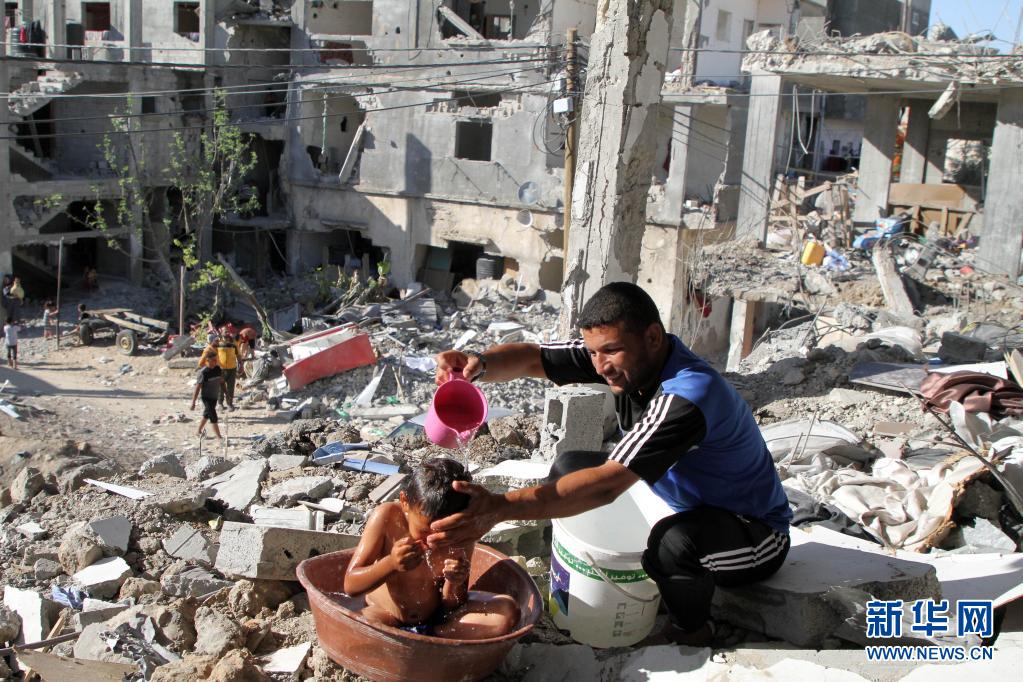 6月7日,在加沙地带北部拜特哈嫩,一名巴勒斯坦人在遭以军空袭损毁的建筑废墟上给孩子洗澡。