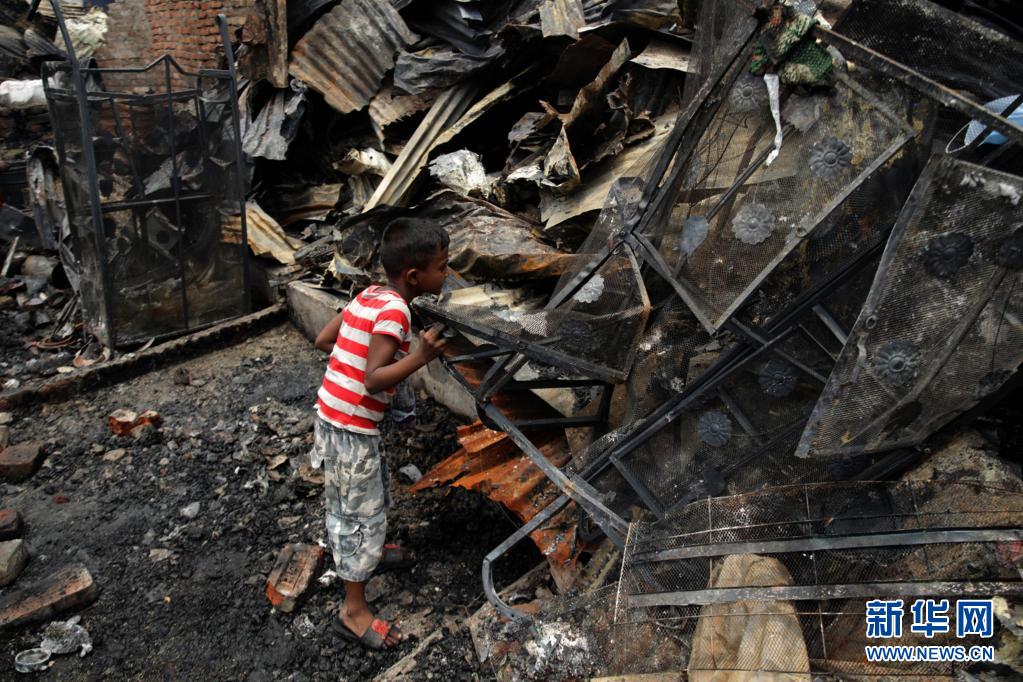 6月7日,一名儿童在孟加拉国首都达卡发生火灾的贫民窟废墟中寻找个人物品。