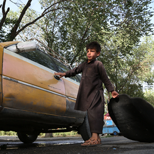 6月11日,一名童工在阿富汗首都喀布尔街头洗车。