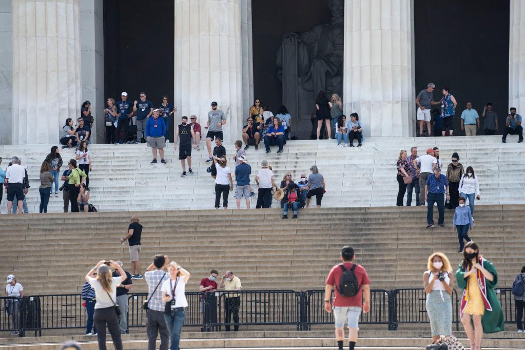 4月27日,人们在美国首都华盛顿的林肯纪念堂附近游览。(新华社记者刘杰摄)