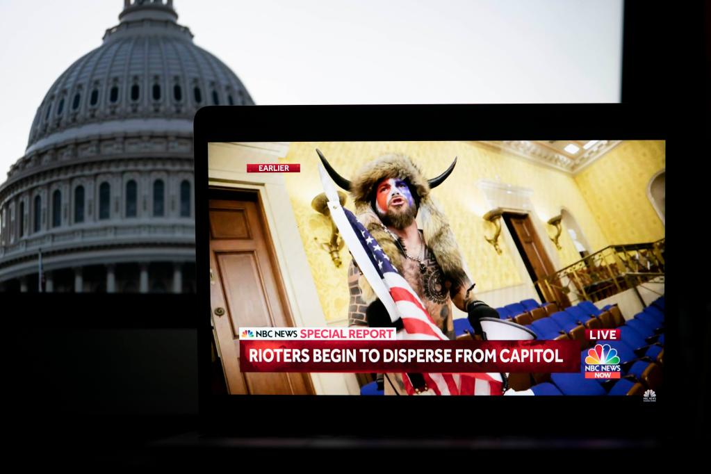 这张2021年1月6日拍摄的电视画面显示,一名抗议者闯入位于美国华盛顿的国会大厦。新华社记者 刘杰 摄