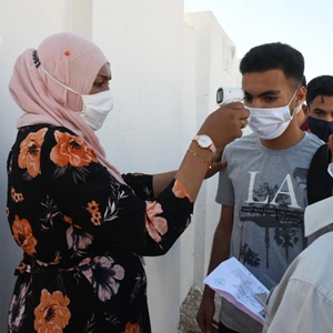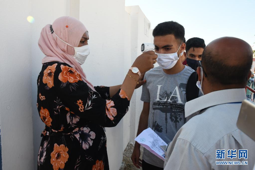 6月16日,工作人员在突尼斯首都突尼斯市一个考场外给准备参加高等学校入学考试的学生测量体温。