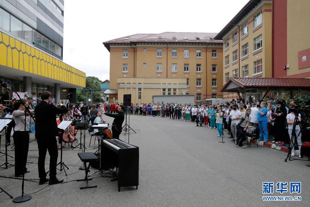 当日,罗马尼亚首都布加勒斯特一个乐队在该国一家传染病医院——马太·巴尔什医院演出,向抗击新冠疫情的医务工作者致谢。