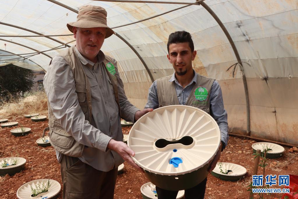 6月10日,在约旦阿杰隆地区,艾哈迈德·拉巴巴(右)和荷兰Groasis公司约旦地区负责人迈克尔·许林展示“智能水源培养箱”。新华社记者 冀泽 摄