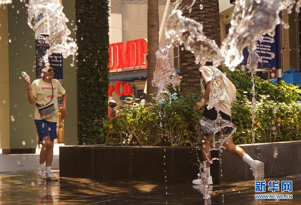 6月16日,美国加利福尼亚州洛杉矶市民在喷泉旁戏水纳凉。加州南部本周迎来今年的首次高温天气。