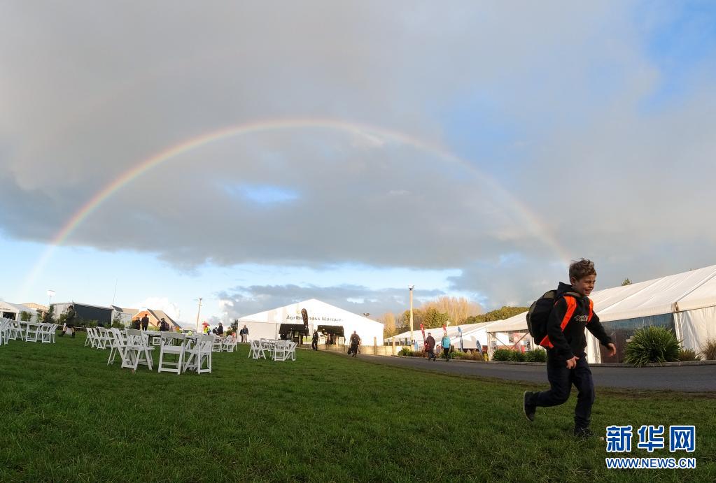 这是6月17日在新西兰汉密尔顿举行的国际农业博览会上拍摄的空中彩虹。