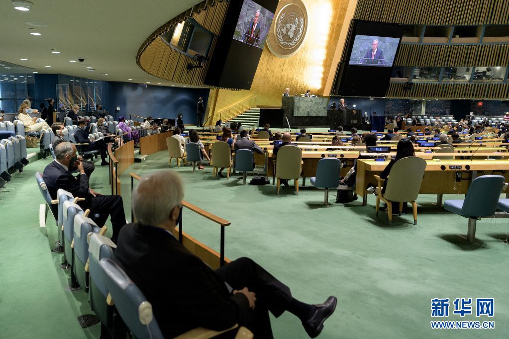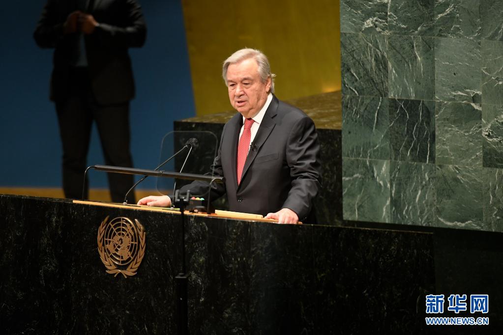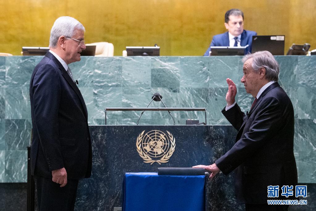 6月18日,在位于纽约的联合国总部,安东尼奥·古特雷斯再次被任命为联合国秘书长后向联合国大会发表讲话。新华社发(联合国供图/埃万·施奈德摄)