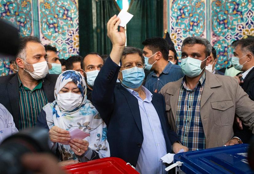 6月18日,总统候选人央行前行长阿卜杜勒纳赛尔·赫马提(中)在伊朗德黑兰一个投票点投票。新华社发(艾哈迈德·哈拉比萨斯摄)