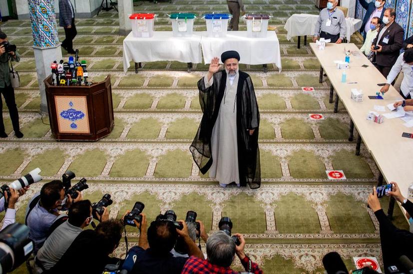 6月18日,易卜拉欣·莱希在德黑兰的一个投票站投票后向媒体致意。新华社发(艾哈迈德·哈拉比萨斯摄)