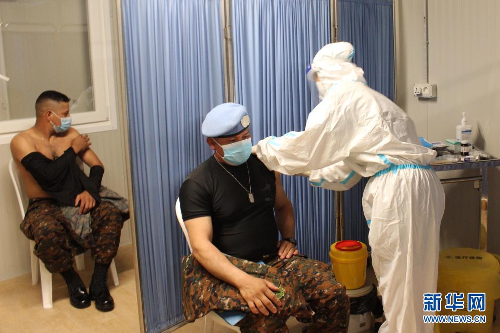 6月28日,在黎巴嫩南部迈尔季欧云地区伊贝尔·萨吉村中国维和医疗队营区,中国维和医疗队队员为联黎部队官兵注射新冠疫苗。新华社发(余巍摄)