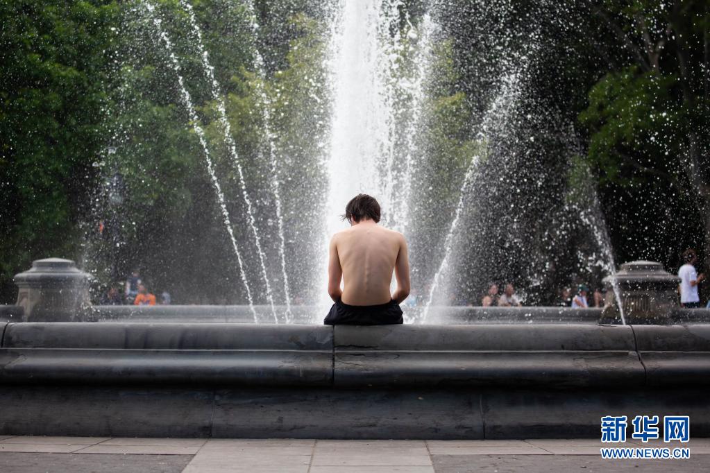 6月29日,在美国纽约一处公园,一名男子坐在喷泉边纳凉。