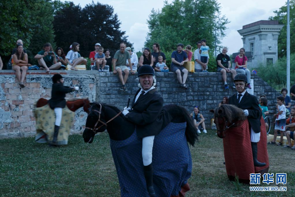 6月30日傍晚,艺术工作者在斯洛文尼亚首都卢布尔雅那进行街头戏剧节表演。
