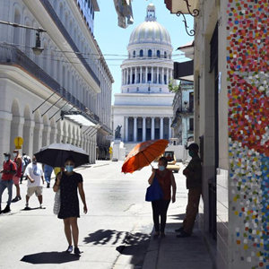 7月2日,人们佩戴口罩在古巴首都哈瓦那出行。