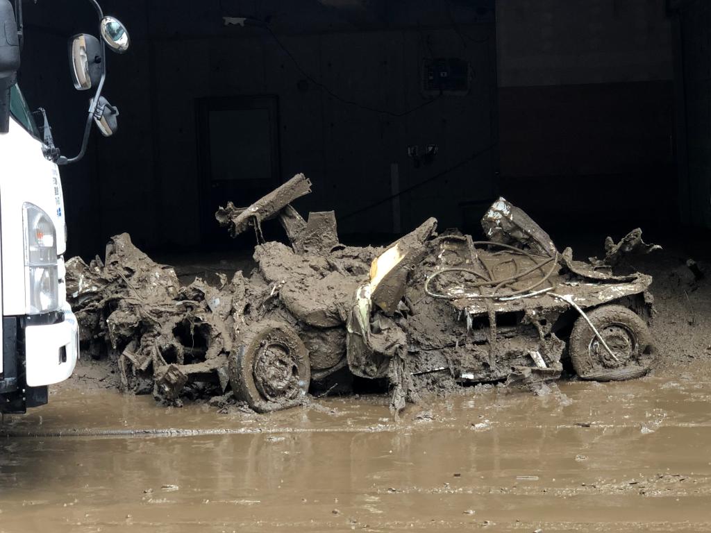 7月4日在日本静冈县热海市拍摄的在泥石流灾害中受损的汽车残骸。新华社记者华义摄