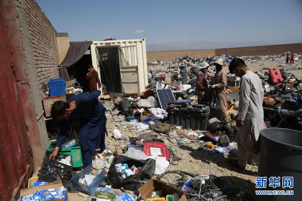 7月3日,在阿富汗帕尔万省的巴格拉姆空军基地附近,当地居民在美军遗留下的物品中回收废旧物。