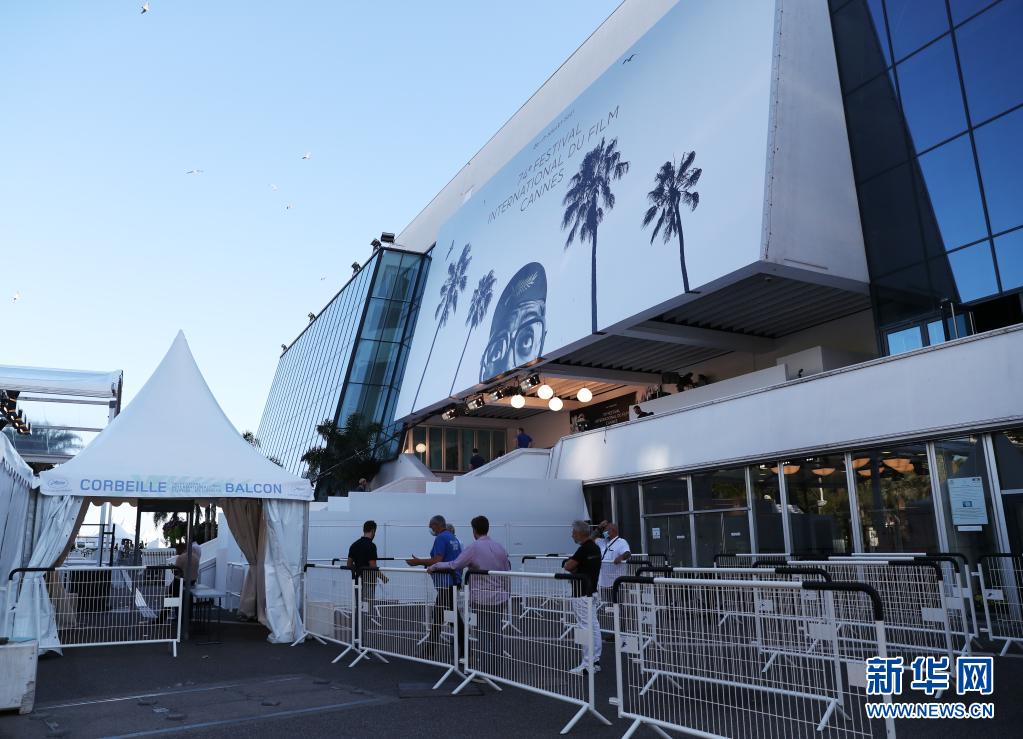 7月5日,工作人员在法国戛纳的电影宫外为开幕式做准备。