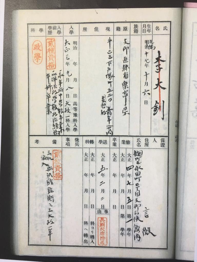 在早稻田大学中国校友会提供的李大钊学籍卡扫描件上,记者清晰地看到,除了李大钊的姓名、住址、籍贯等基本信息外,还有李大钊的入学信息。日本李大钊研究专家、爱知县立大学教授川尻文彦介绍,从备考一栏可以看出,李大钊是免试入学的。