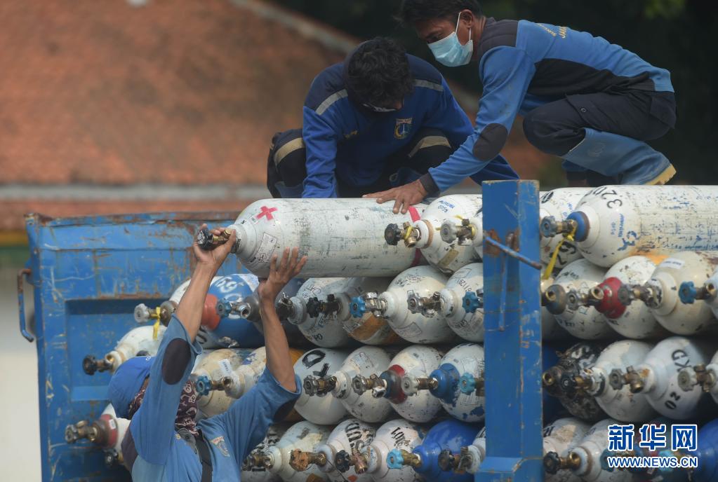 7月5日,工人在印度尼西亚雅加达一处充氧点搬运氧气罐。印度尼西亚5日通报单日新增新冠确诊和死亡病例均创新高。印尼政府当天要求制氧企业把所有氧气供应给医疗机构,宣布开通远程医疗服务、增加抗疫医疗支出。新华社发(祖卡南摄)