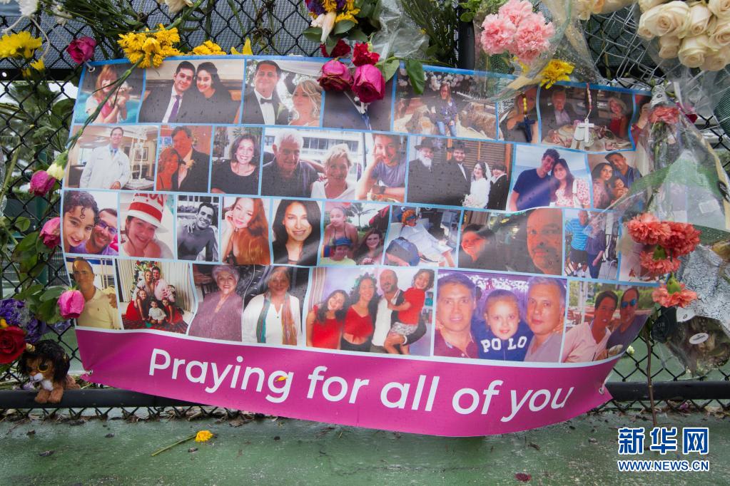 这是7月6日在美国佛罗里达州迈阿密-戴德县坍塌的住宅楼附近拍摄的悼念墙。新华社发(莫妮卡·麦克盖文摄)