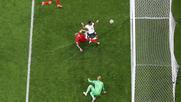 下半场一开场,英格兰队又是围攻之势,但马奎尔的头球、芒特的兜射都被小舒梅切尔神勇扑出。丹麦队体力下降明显,一旦拿球也不再急于突破。