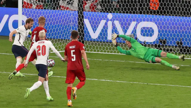 也许丹麦人认为“门神”小舒梅切尔会让他们在点球大战中更有胜算,但加时赛中攻势不减的英格兰队没有给他们机会。斯特林突入禁区造成对手犯规,凯恩随后主罚的点球虽然被小舒梅切尔扑出,但英格兰队队长紧接着补射中的。第104分钟,英格兰队终于2:1实现反超。