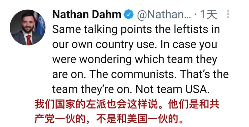 共和党籍的俄克拉何马州参议员内森·达姆也转发了贴文,称美国左派是和共产党一伙的!
