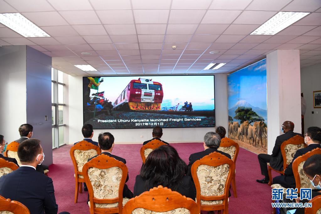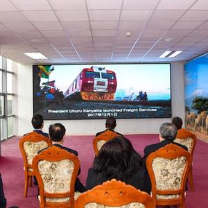 7月9日,在肯尼亚内罗毕,嘉宾观看肯尼亚蒙巴萨-内罗毕标轨铁路(蒙内铁路)已安全运营1500天的宣传视频。新华社记者 李琰 摄