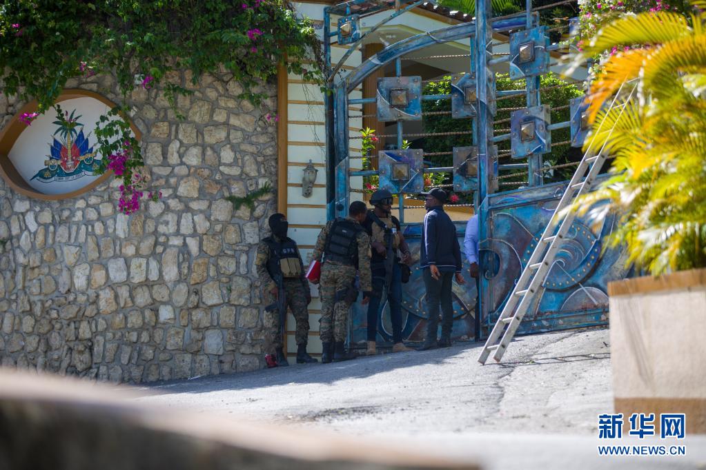 7月7日,在海地太子港,士兵在海地总统莫伊兹的住所入口处执勤。