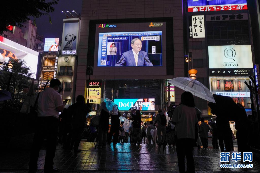 7月8日,日本东京的一块电子屏幕上播放日本首相菅义伟宣布东京都将再次进入紧急状态的新闻发布会画面。