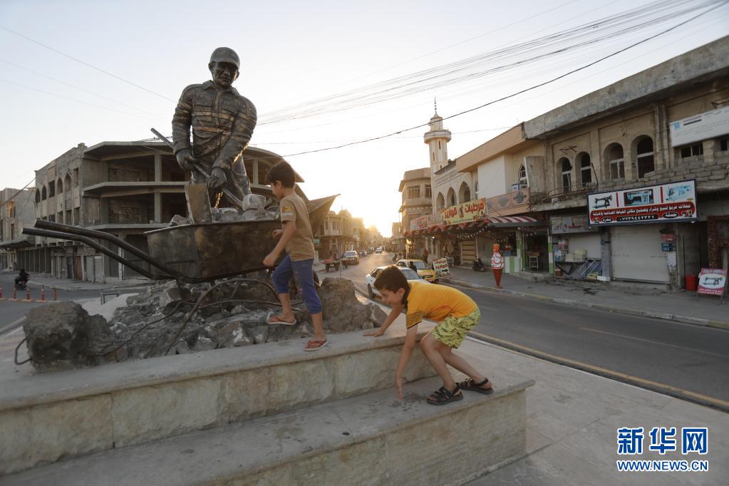 7月3日,两名儿童在伊拉克摩苏尔老城的摩苏尔重建雕塑旁玩耍。