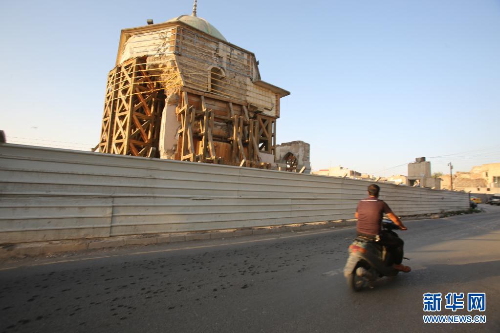 7月3日,在伊拉克摩苏尔老城,一名男子骑摩托车经过努里清真寺。摩苏尔解放前夕,溃败的武装分子炸毁了12世纪所建的努里清真寺及其宣礼塔。在联合国教科文组织“重振摩苏尔精神”倡议支持下,如今努里清真寺院内的废墟已被清理,被炸毁的宣礼塔、清真寺穹顶和残余主体结构得到了加固。