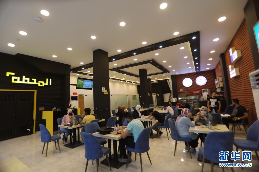7月3日,在伊拉克摩苏尔东城,人们在一家名为Station的创业孵化器内工作。这家创业孵化器为有创业想法的年轻人提供免费办公场所。