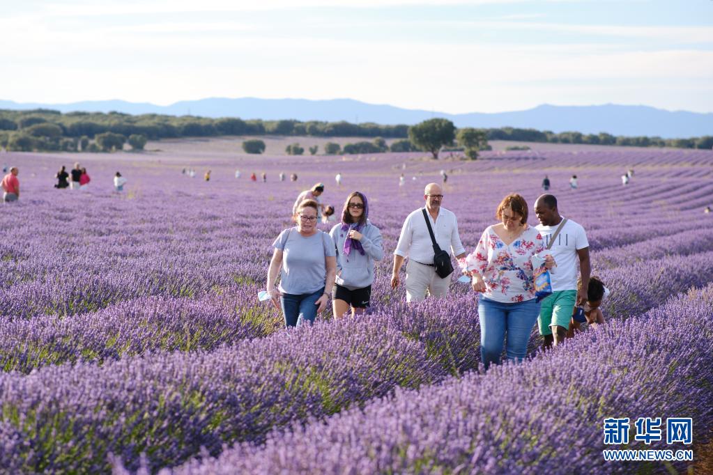 7月13日,人们在西班牙卡斯蒂利亚-拉曼查自治区布里韦加的薰衣草田游玩。