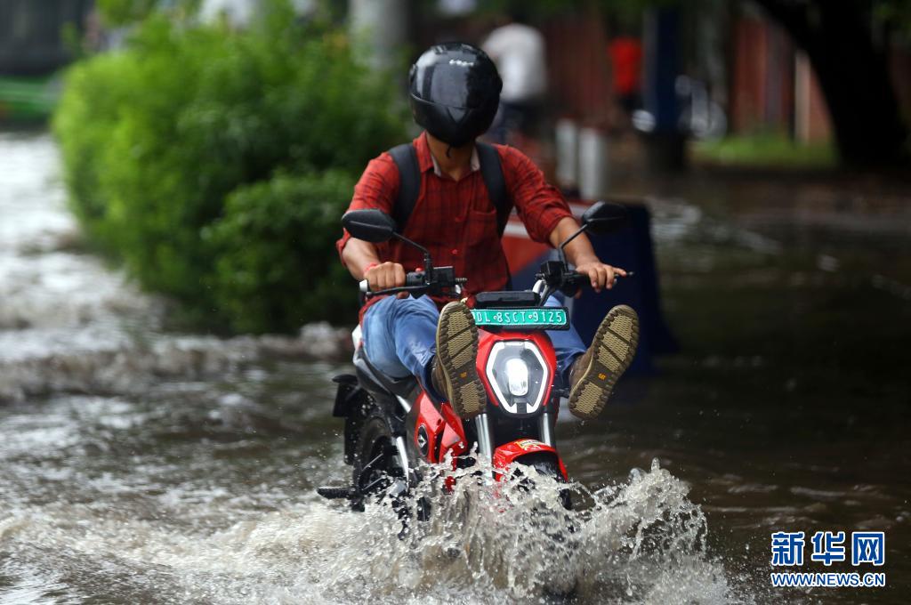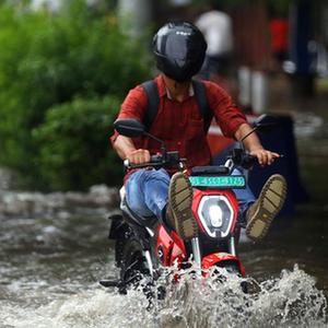 7月14日,一名男子在印度新德里积水的街道上骑行。