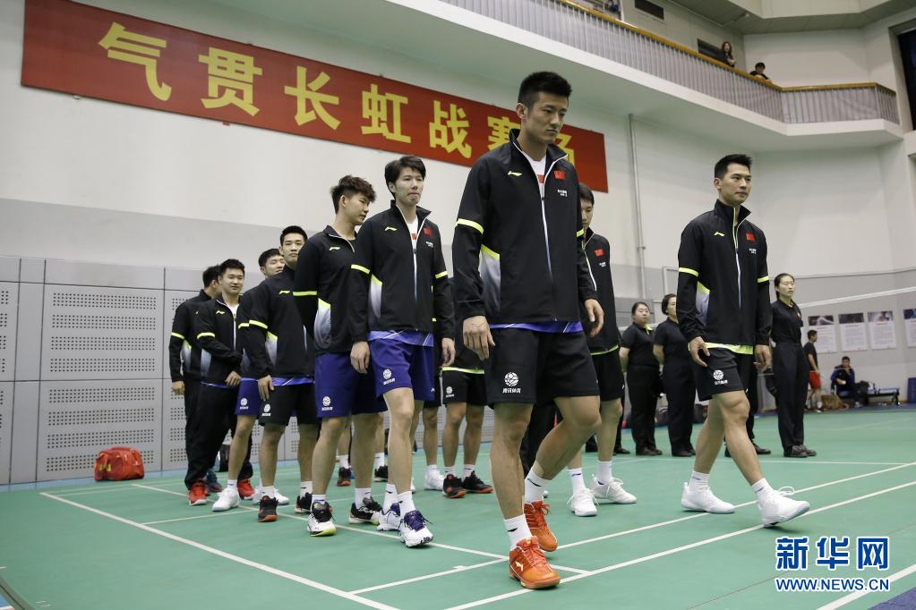 汤姆斯杯模拟赛在国家体育总局训练局羽毛球馆进行,谌龙(前)等参赛球员在赛前出场(2020年10月4日摄)。