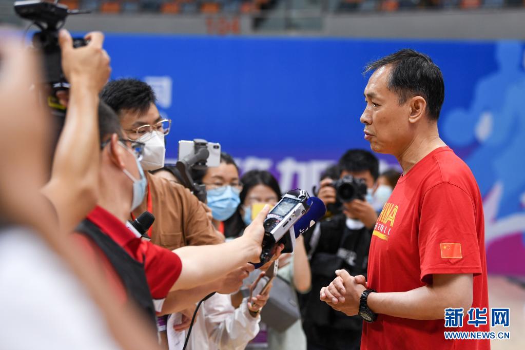 中国女篮在江苏苏州奥体中心体育馆举行公开训练课,主教练许利民(右一)在训练结束后接受采访(2021年7月9日摄)。