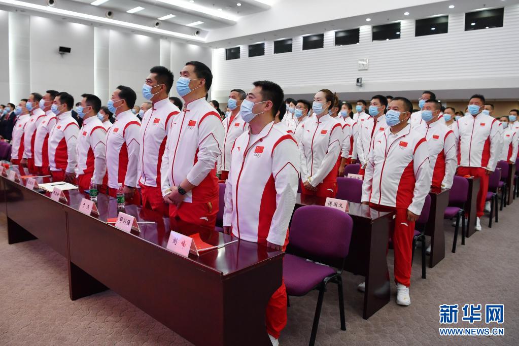 东京奥运会中国体育代表团工作会议在国家体育总局举行。图为代表团成员在奏国歌仪式上(2021年7月14日摄)。