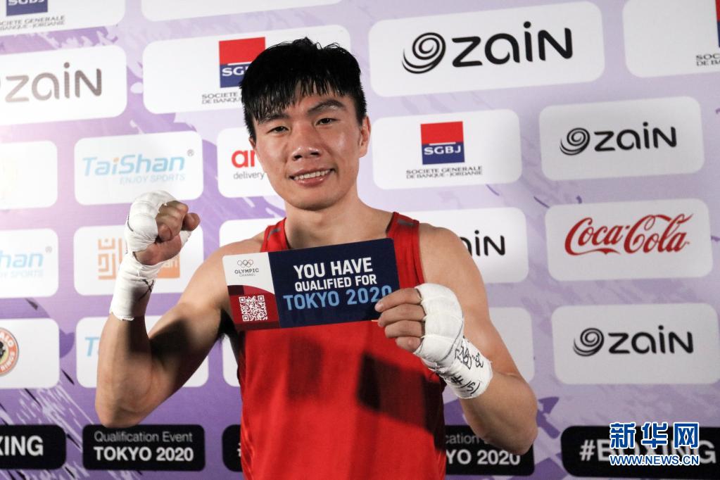 在约旦安曼举行的2020年东京奥运会拳击亚洲大洋洲区资格赛男子52公斤级四分之一决赛后,中国选手胡建关展示东京奥运会入场券(2020年3月9日摄)。