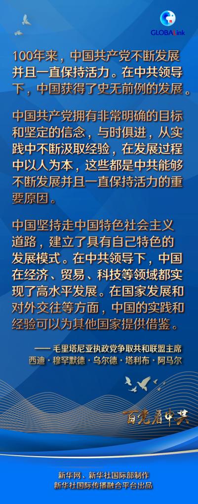 阿马尔对中国共产党成立100周年表示热烈祝贺。他说,中国共产党拥有非常明确的目标和坚定的信念,与时俱进,从实践中不断汲取经验,在发展过程中以人为本,这些都是中共能够不断发展并且一直保持活力的重要原因。