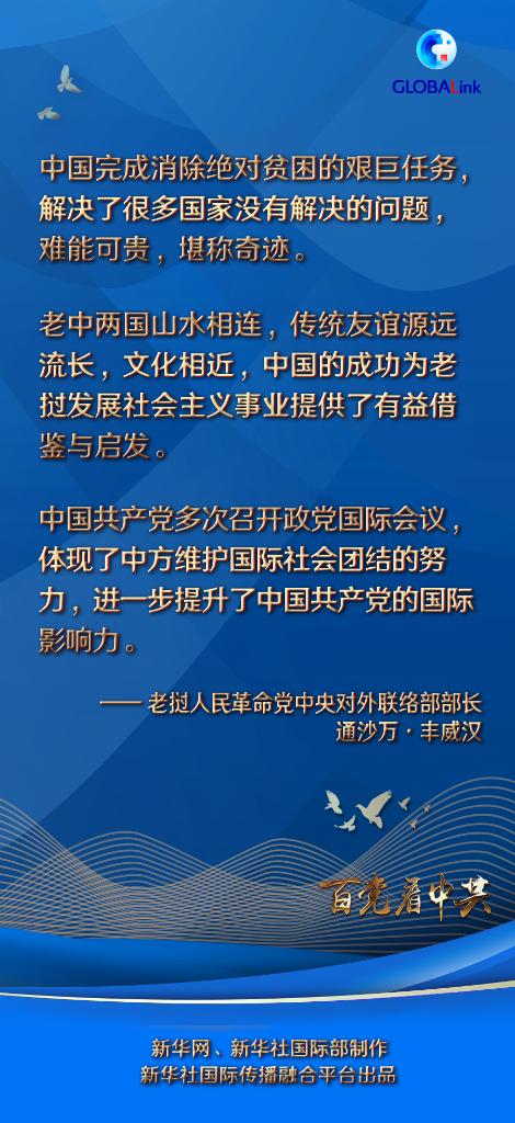 通沙万说,中国共产党坚持以人民为中心,团结带领中国人民取得了举世瞩目的辉煌成就,特别是中共十八大以来,以习近平同志为核心的中共中央团结带领中国人民砥砺奋斗,取得新冠疫情防控重大战略成果,夺取脱贫攻坚战全面胜利,全面建成小康社会,开启全面建设社会主义现代化国家新征程,彰显了社会主义制度优越性,为包括老挝在内的广大发展中国家探索符合本国国情的发展道路提供了有益借鉴。