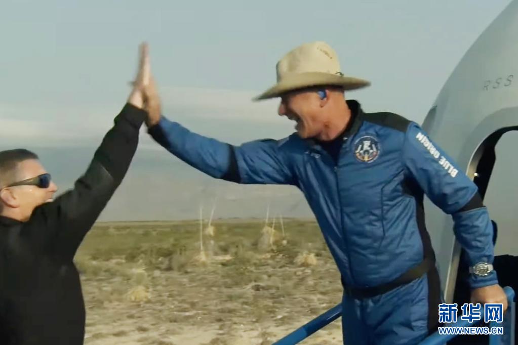 这张美国蓝色起源公司7月20日发布的视频截图显示,“新谢泼德”飞行器在美国得克萨斯州西部着陆后,该公司创始人杰夫·贝索斯(右)走出飞行器庆祝。