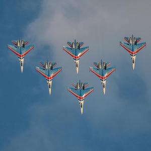 7月20日,俄罗斯“勇士”飞行表演队在首都莫斯科附近的茹科夫斯基市举办的莫斯科航展上进行飞行表演。