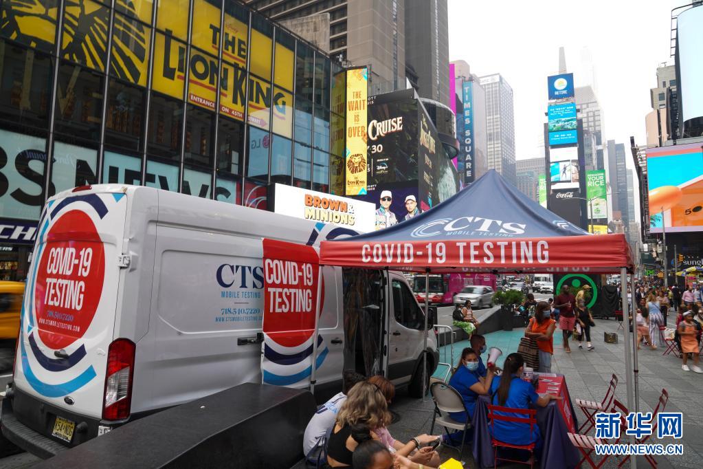 7月20日,工作人员在美国纽约时报广场的一个移动新冠检测点工作。