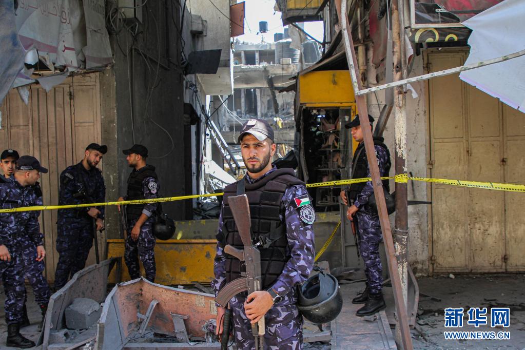 7月22日,警察在加沙城一个市场的爆炸现场警戒。